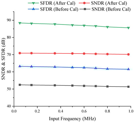 Figure 10 shows the SNDR and SFDR vary with the input frequency at a constant sampling rate of fs = 2 MS/s. Both the SNDR and SFDR are decreasing slightly with the input frequency increase before and after calibrations. Both SNDR and SFDR improved significantly after calibration.