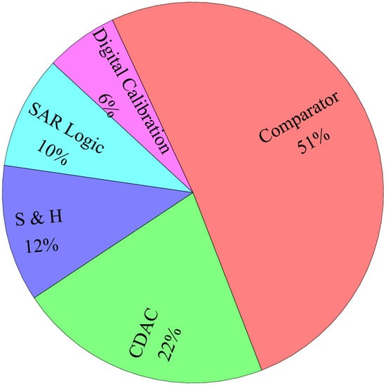 The breakdown of the power consumption of the SAR ADC test chip is shown in Figure 11. The comparator, capacitor digital-to-analog converter (CDAC), and sample and hold circuits are the main proportion of power consumption. The digital background calibration circuitsonly account for 6% of overall power consumption.