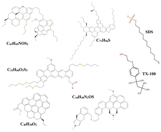 Chemical formulas and structures of asphaltene and surfactant molecules.