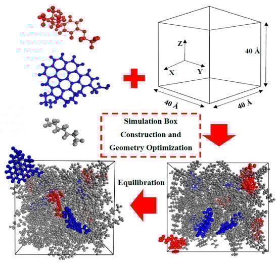 We used the Materials Studio software package (2020) [64] to carry out the molecular dynamics simulation. Table 1 provides the details, including parameters, ensembles, and methods, of the MD simulation. As reported in Table 1, the COMPASS force field was utilized in this study. The non-bonded interactions in this force field were Coloumbic and van der Waals interactions. The bonded interactions comprised different interactions, e.g., bond, angle, and torsion [65]. More information regarding the force field components and their definitions can be found in [37]. Figure 1 demonstrates the chemical formulas and structures of asphaltene molecules used in this paper. Table 2 reports details of all scenarios, including the simulation box’s final size, system ID, surfactant, and asphaltene types and their H/C ratio. Figure 2 demonstrates the workflow of constructing a simulation box for performing MD simulations. As shown in Figure 2, five asphaltenes, five surfactants, and two hundred heptane molecules were placed in the simulation box with 40 Å × 40 Å × 40 Å dimension. As mentioned earlier, five different asphaltene molecules with different sources were used in the current work to evaluate the performance and efficacy of both anionic and non-anionic surfactants in the inhibition or dispersion of asphaltene aggregation in a heptane solution.