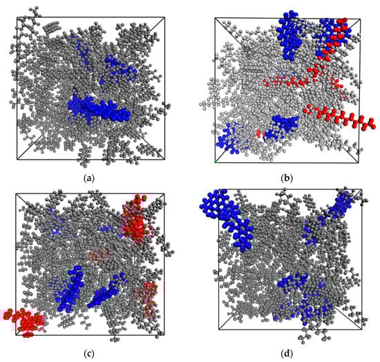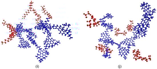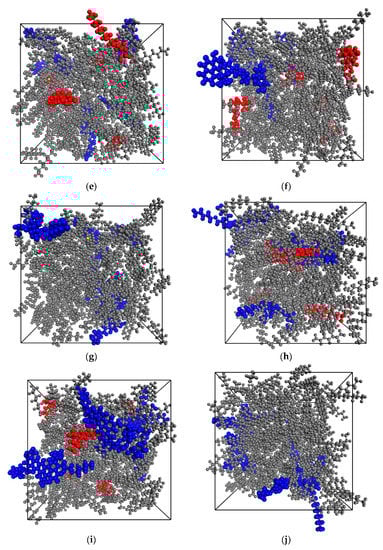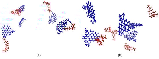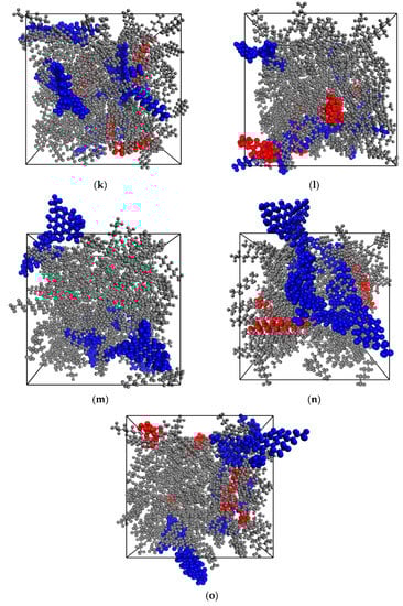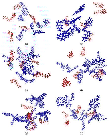 Figure 3 demonstrates the snapshot of the molecules’ configuration in the simulation box for all fifteen systems at the equilibrium condition. Red molecules denote surfactants, blue molecules represent asphaltenes, and grey molecules stand for heptane. As demonstrated in Figure 1, the constructed simulation box needed to be optimized first. We performed the steepest descent algorithm for 200,000 iterations with convergence tolerance of displacement of 10−1 Å and energy of 2 × 10−5 kcal/mol to optimize the simulation box. After the geometry optimization process, we applied the NPT ensemble at a pressure of 1 Mpa and 298 K for 200 ps on each simulation box to equilibrate the simulation box. The configurations shown in Figure 3 were captured at the end of the equilibration process.