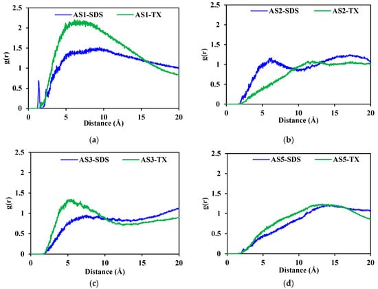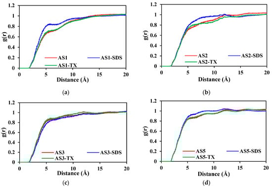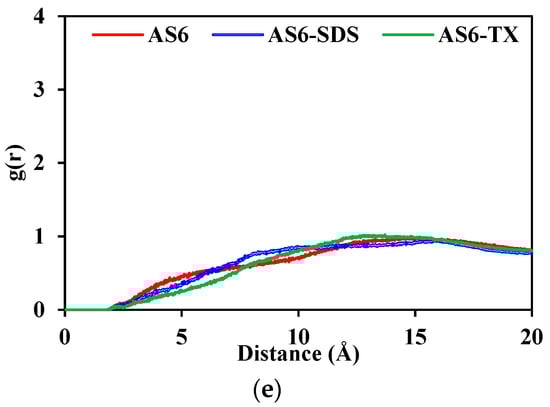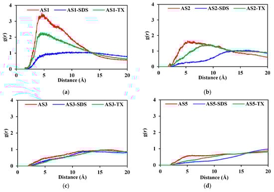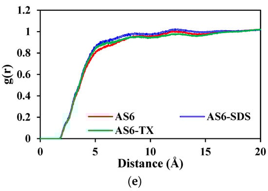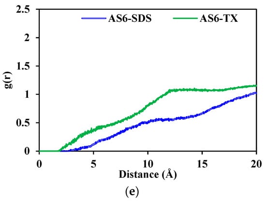 Figure 4 depicts the RDF of asphaltene pair molecules for all systems. Based on the asphaltene molecular structure, different types of molecular interactions can occur. As illustrated in Figure 4a,b, the SDS surfactant had a lower RDF spike than the systems containing TX-100 and asphaltene without surfactant. However, in the cases of AS3, AS5, and AS6, no significant and meaningful difference between RDF plots for asphaltene in the presence of SDS and TX-100 could be observed (see Figure 4c–e). The probable reason behind this observation is because of the large asphaltene molecule size of these asphaltene molecules compared to AS1 and AS2. Hence, a macromolecular structure between asphaltene pairs in a short-range distance could not be observed for AS3, AS5, and AS6. Another reason to observe such results is because of a high H/C ratio (greater than one) of these asphaltene molecules, which means lower aromaticity. As reported in Table 2, only asphaltenes AS1 and AS2 had a H/C ratio of lower than one, revealing their higher aromaticity. The high aromaticity of asphaltene molecules favors for an asphaltene aggregation process. In other words, asphaltenes with high aromaticity are most likely to aggregate under specific thermodynamic conditions; however, asphaltenes with very low aromaticity probably do not tend to aggregate in wise ranges of thermodynamic conditions envelopes. That is why significant peaks could only have been observed for asphaltenes AS1 and AS2.
