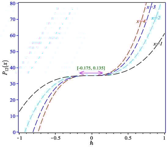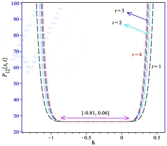 Equation (47) is a approximation solution for pressure P to the problem Equations (25)–(36) in terms of the convergence parameters ℏ and order with . To find the valid region of ℏ, the ℏ-curves given by the 12th-order HAM approximation at different values of x are drawn in Figure 2; this figure shows the interval of ℏ in which the value of is constant at certain x, and M; we chose the horizontal line parallel to x-axis (ℏ) as a valid region which provides us with a simple way to adjust and control the convergence region.