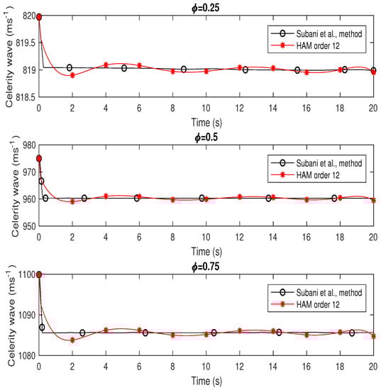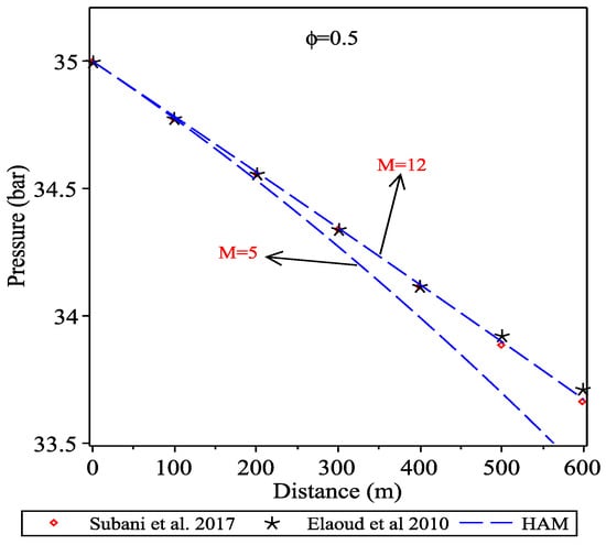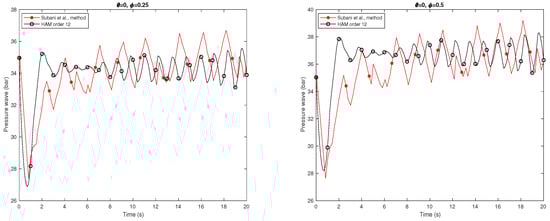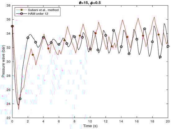 Figure 5 presents the transient pressure of hydrogen natural gas mixture for isothermal flow when leakage occurs at in horizontal pipeline. The homotopy analysis method of order with has been used. This figure shows the comparison between homotopy analysis method from order 12 and Subani et al. method [] when and .