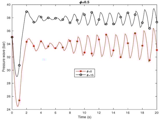 The transient pressure of mixture of natural gas and hydrogen with a mass ratio of is shown in Figure 7 in case of isothermal flow and leak location at with diverse angles. The homotopy analysis method from order 12 and has been used. Red line is for and black line is for .
