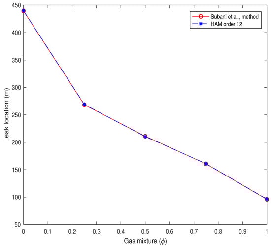 The leak locations were detected using the homotopy analysis method for horizontal pipeline () and inclined pipeline () for gas mixture . Using the homotopy analysis method the celerity wave at leak point of the pipeline are 819.20 ms, 964.60 ms and 1086.60 ms for and , respectively.