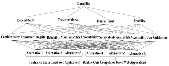 Figure 1 shows that the quality of the web application can be enhanced by applying the durability factor in the development phase. In Figure 1, six alternatives have been taken for choosing the best alternative between two web applications. The two alternatives are real time web applications. One of these is the entrance exam based web application, and the second one is an online quiz competition based web application. Three different alternatives for both the web applications have been taken into this research for estimation of durability of web application.