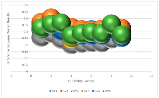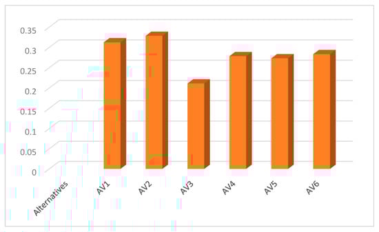 This portion of the section provides a realistic assessment of evaluated results on highly sensitive web applications of the University. Further, to analyze the hesitant fuzzy TOPSIS methodology, the authors selected 6 different web application projects of BBA University (India) [6,8] that are represented by AV1, AV2, AV3, AV4, AV5, and AV6 for assessment. With the help of the Equation (17) and step 10, authors took the inputs on the technical data of six projects of the University. Table 5 below illustrates the results in a combinative manner. Table 6 and Table 7 portray the normalized and weighted normalized values of alternatives in perspective of durability characteristics with the help of the Equations (18)–(24). According to Table 6, maintainability (with the weight 0.1795) has the highest weightage in estimation of durability of web application. While, as per Table 3, trustworthiness with the weight of 0.5242, has the highest priority among level 1 characteristics. This suggests that while designing a durable web application, developer should focus on trustworthiness and maintainability. This will lead to a more durable web application. Lastly, satisfaction degrees of different alternatives are estimated with the help of Equations (25) and (26), as shown in Table 8 and Figure 2.