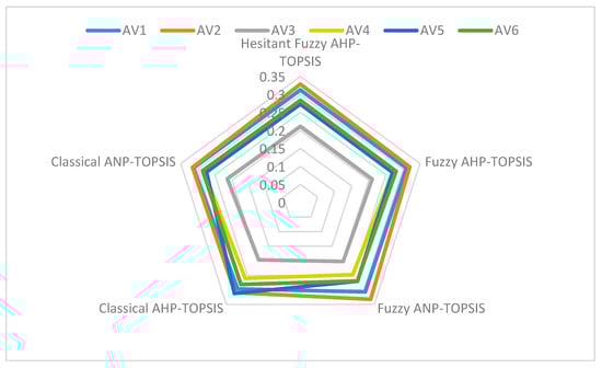 Comparing the results obtained from different methods gives an ideal understanding about the variation of numerical assessment in various techniques. We compared the hesitant fuzzy AHP-TOPSIS technique with the other four techniques of MCDM including Fuzzy AHP-TOPSIS, Fuzzy ANP-TOPSIS, Classical AHP-TOPSIS, and Classical ANP-TOPSIS for gauging the effectiveness of the proposed technique [7,8,9,10]. Although hybrid methods such as Fuzzy AHP-TOPSIS and Fuzzy ANP TOPSIS give good results, but in the current case of characteristics of web application durability, hesitant fuzzy AHP TOPSIS proves to be the accurate one [11,12,13,14,15]. The results obtained through the comparison were not so varied and different from each other but the accuracy of results differed from each other. The hesitant fuzzy AHP-TOPSIS technique has an advantage of assigning hesitant fuzzy set valuation in assigning values to characteristics. The calculated results are tabulated in the Table 10 and Figure 4.