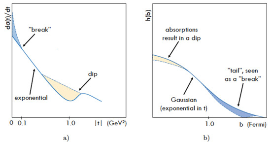 (a) Typical shape of the high-energy differential (diffractive) cross section, and (b) Its impact-parameter image. A “dictionary” relating the shape of the diffraction cone (in t), left icon to its impact-paramter image (rignt), and highlighting their two silent features: the “break”, origin of nucleon’s atmosphere and the dip-bump, resulting from absorptions (unitarity!) at small values of the impact parameter, see [13].