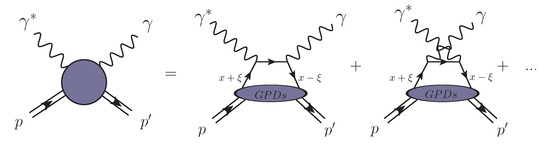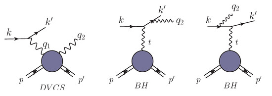 Phenomenologically, exclusive electroproduction of a real photon, DVCS, depicted in Figure 3 (left), is the golden channel to constrain GPDs as it is theoretically clean and the phase of its amplitude can be measured using the interference with the Bethe–Heitler (BH) amplitude (see Figure 3; cf. Figure 4 and Figure 5).