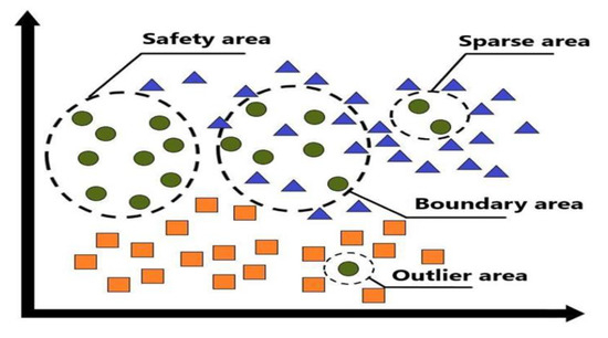 All data points will be identified based on four different areas (the safety, boundary, sparse, and outlier area) according to the criteria of area identification, as shown in Table 1. For each data point, the nearest five reference points are found, and the function cn(e) is used to represent the number of data points in the nearest neighbors of the five reference points, where e indicates that the labels have the same class. In addition, let the function cn(i) be the class label without consideration, which represents the number of data points of the nearest neighbor among the five reference points for each data point, where i represents the i-th data point. The concept of the proposed safe-region imputation method can be expressed by three different label data presented in four different areas (the safety, boundary, sparse, and outlier area), as shown in Figure 1.