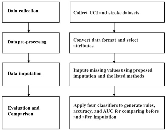 To verify the effectiveness of the proposed imputation method, we use kNN and multiple imputations to compare the results with the proposed method when handling MVs. In addition, this study used four rule-based classifiers to generate the rules, accuracy, and AUC for comparison before and after imputation. To easily understand the proposed method, we proposed a computational procedure including data collection, data preprocessing, imputation, classification and evaluation, as shown in Figure 2. The detailed steps are described in the following.