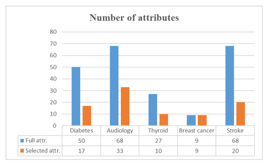 This study applied the Condorcet ranking method [43] to integrate the selected attributes of four attribute selection methods. We use the breast cancer dataset as an example. The original breast cancer (Wisconsin) dataset contains nine numerical attributes (excluding the ID attribute) with 699 records and 16 MVs. First, the four attribute selection methods were used to generate important attributes and weight values; the results are shown in Table 4. Second, we ranked the ordering of the selected attributes based on the weight values for each attribute selection method and then summed the four rankings to re-rank the ordering, as shown in the last column of Table 4. Lastly, we determined whether the weight value of each attribute selection method was significant (e.g., lower weight than 0.423 in correlation is statistically significant). Hence, no attribute was discarded, and nine attributes remained. The numbers of attributes among the full and selected attributes in each dataset after integrating the four attribute selection methods are shown in Figure 3. The number of attributes in most datasets was reduced by half except for the breast cancer dataset.
