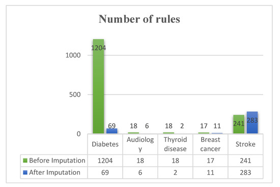 After imputing the MVs of the five datasets using the proposed safe-region, kNN, and multiple imputation techniques, we use decision tree, random forest, REP tree, and LMT classifiers to generate the results for before and after imputation based on the criteria of the number of rules, accuracy, and AUC, as shown in Table 5 and Table 6. In terms of accuracy, Table 5 shows that the proposed imputation is better than removing MVs and listing imputations in five datasets except for the Thyroid disease dataset. Here, kNN imputation provides better accuracy. As shown in Table 6, the proposed imputation is better than removing MVs and listing imputations in the AUC, except for removing MVs in the audiology dataset and using kNN imputation in the thyroid disease dataset, which provided a better AUC. The proposed imputation has fewer rules than imputations done before and listing imputations, except for the stroke dataset, as shown in Figure 4, where the results after imputation are based on using the best accuracy of imputation to generate the rules. Overall, the proposed imputation is better than removing MVs and listing imputations in terms of accuracy, AUC, and the number of rules for five the datasets.