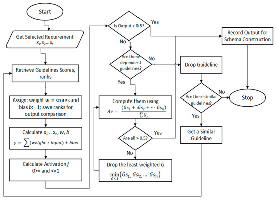Now, because the requirements are linearly separable, True (T) and False (F) are attached to each guideline and the OR Boolean is used to determine the combination, which will collectively be summed up as the input of our activation function. The activation function in DSP is a function that calculates the possibility of including or excluding a guideline from the list of applicable guidelines. The verdict ranges from 0 to 1, where 1 is fully accepted (True) or 0 fully rejected (False). The average value for consideration is 0.5. Any guideline that falls below the average is given low priority except when another guideline that depends on it is considered. In such cases, the weight of the two or more guidelines are put together and divided by their numbers to get the average. This is done using Equation (6).