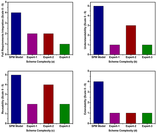 Understandability is one of the most important factors that determines the level of complexity. This is because it is only when a schema is understood that other activities such as possible extension or integration can take place. In Figure 18b, the understandability results of DSP model and formal methods are presented. A scale of 0–5 was used as a ranking measurement (0 = not-understandable and 5 = Highly-Understandable). Expert1 and Expert3 have the least understandable schemas with a scale of 1 each, while Expert2 schema scored up to 3 out of 5. However, the schema produced by DSP model has the highest level of understanding (4 out of 5), as indicated in Figure 18b.