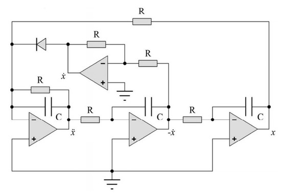 In 2011, Sprott [19] studied a simple chaotic jerk circuit, as shown in Figure 2, consisting of only five electronic components: two capacitors, an inductor, an adaptive resistor and a nonlinear resistor. His work shows a chaotic behavior of the trajectories around the equilibriums of the system, and launches a quest for other circuits that chaotically oscillate. Indeed, this circuit can be formulated into a third-order ODE consisting of a nonlinear term, called a “jerk”or the third-order derivative of a variable.