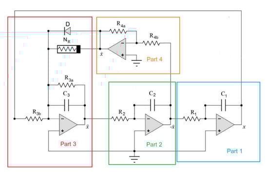 In this section, we formulate a mathematical model for a modified chaotic jerk circuit with Chua’s diode in terms of a system of ODEs concerning a piecewise linear function and exponential term. We divide the circuit into four parts, as illustrated in Figure 3. Our analysis is based on fundamental theory of electrical circuit analysis such as Ohm’s law, Kirchhoff’s current law (KCL) and Kirchhoff’s voltage law (KVL).