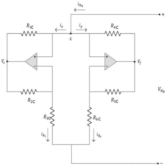 The circuit in Figure 4 is a more complicated one since it consists of two nonlinear resistors. For the nonlinear resistor on the left, we have by Ohm’s law that , and , where is the voltage of the op-amp on the left hand side. Combining these three equations to get where
