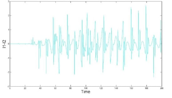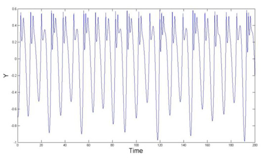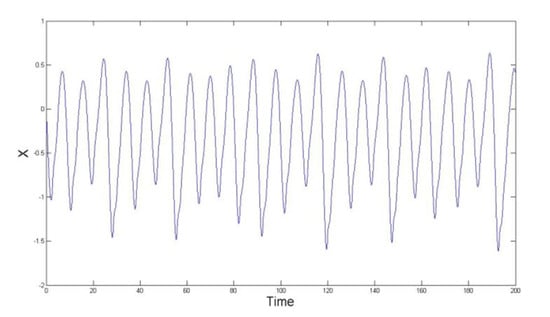 The time waveforms of , and are reported in Figure 7, Figure 8 and Figure 9, where the time interval is in . We see that the oscillations in the figures are non-periodic.