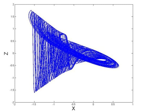 In this section, we provide a numerical experiment to illustrate the chaotic behavior of the proposed circuit via MATLAB. Consider the circuit in Figure 3 with the following parameters: k, , , , k, k, , , , , , , F, F, F, , , and . We set the initial condition to be .
