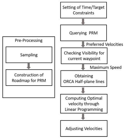 The simulation follows the steps illustrated in Figure 1. In the pre-processing step within Figure 1, given a set of static obstacles, the algorithm constructs a roadmap through the PRM planning method. At run time, the user first specifies the target position and time duration constraints for all agents. Then, the waypoints are obtained through a roadmap query to the PRM. The waypoints behave like sub-goals, as the agent moves to the target. The current waypoint is set to the starting waypoint in the beginning, and moves to the next waypoint as the agent passes by. The preferred velocity can be computed from the current waypoint and the agent’s position. Further, the visibility is checked to see if there are any obstacles up to the current waypoint. If there is no obstacle, then the maximum speed parameter is adjusted so that the agent can move through the current waypoint, while satisfying the time constraints.