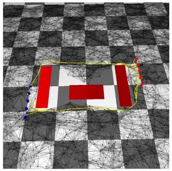 This section explains the roadmap construction using the PRM method. To navigate through the highly complicated environment where many static obstacles exist, the agents must have a rough picture of the paths that they move along. For this purpose, the algorithm constructs a roadmap that guides agents to the target positions. There are many sophisticated high-level motion planning algorithms available in robotics research, including PRM, RRT (rapidly-exploring random tree), and others [18]. Among them, we use the PRM owing to its simplicity in implementation. Figure 2 shows an example of a roadmap constructed by the PRM.