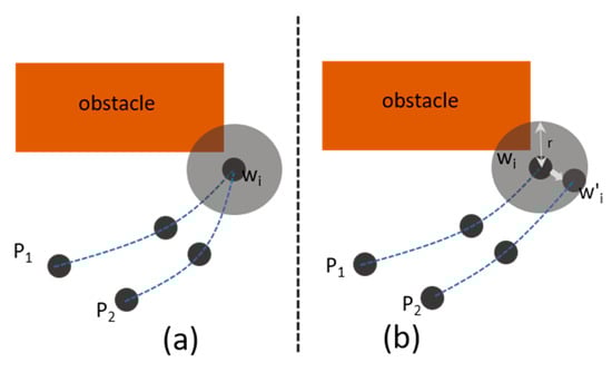 One issue of the original PRM is that it does not support multiple agents, due to which two agents can sometimes have similar paths if their initial and target positions are not separated far enough. To solve this problem, the proposed algorithm randomly perturbs the path when the two agents share the same waypoint. Assume that there are two paths P1 and P2 as shown in Figure 3. In Figure 3a, it happens that both P1 and P2 have the same waypoint wi. In this case, if those two agents have a similar speed, then there is a high chance that the two agents would bump into each other at some point in time. To prevent this collision, the algorithm maintains an internal count variable for each waypoint. If a certain path uses a waypoint, then the count variable increases its value. If another path lies on the same waypoint, then instead of using the original waypoint, the algorithm finds a new position that is close to the original waypoint. The new position should not lie on any static obstacles and should be a within a threshold distance range from the original waypoint. Figure 3b explains the new position, perturbed from the original waypoint.