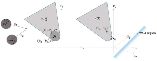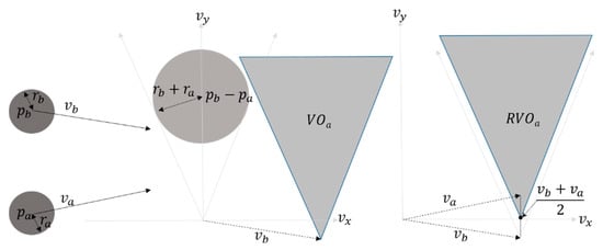 The velocity obstacle (VO) is defined as a set of velocities that lead to a collision for moving an agent a, if the agent maintains its current velocity for a short period [1], given other dynamically moving agents playing the role of moving obstacles. In general, VO is defined in velocity space. Specifically, assume that is a VO induced by agent a. Then, VO is constructed by translating a collision cone, a set of velocities that lead to a collision eventually, given the velocity of agent a, denoted by . Figure 4 illustrates the VO for agent a given another agent b. Although we discuss the method only for agent a given another agent b, the method can be applied to the agent b given agent a, because the method is reciprocal.
