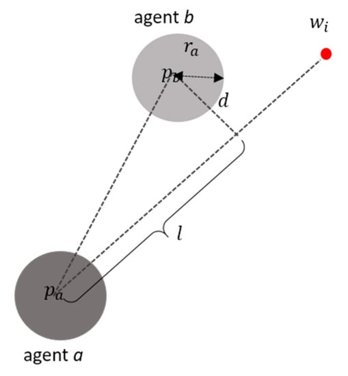 The visibility check decides if there are obstacles to the current waypoint. Clearly, all waypoints are sampled so that they are not inside static obstacles. Therefore, the visibility checking here only accounts for other moving agents in the straight line to the current waypoint assuming that current waypoint is visible from the current agent unless there are other agents in between. Mathematically, assume that we have agent at the position and their current waypoint is . Then, if the distance , the length of the perpendicular vector to as indicated in Figure 5, is smaller than the agent’s size , it shows that the waypoint is not visible from . Otherwise, the agent can go to the waypoint directly. The distances and are calculated by following Equations (1) and (2):