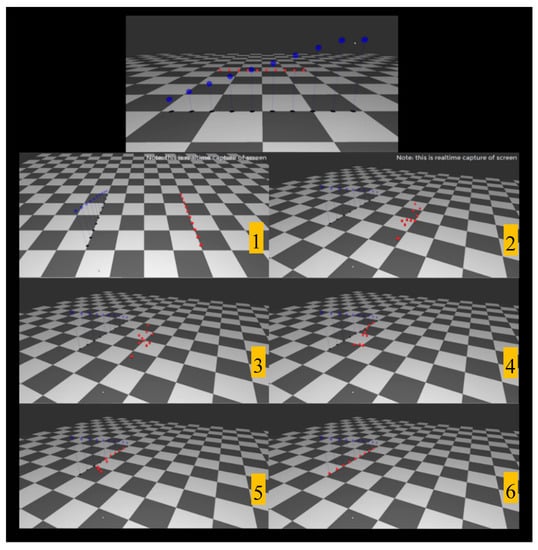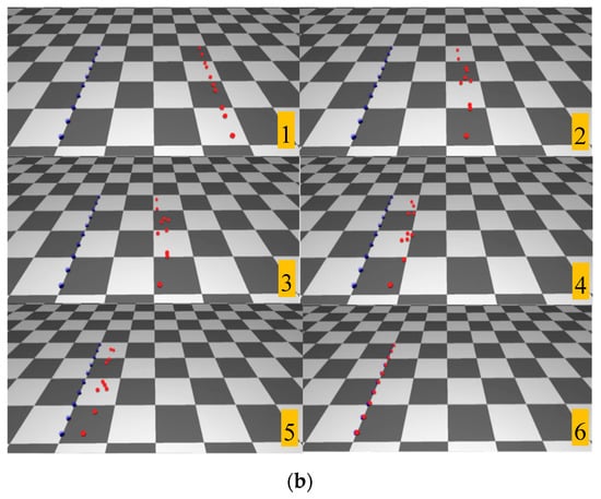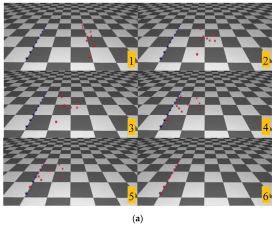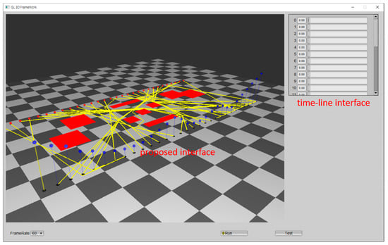 Figure 9 shows the proposed user interface for time constraints integrated with the environment. Users can adjust the relative time gap between two agents by moving the time points up and down, i.e., by conveniently dragging the mouse. In this scenario, agents were required to arrive at their target positions in the left-to-right order. The simulation result shows that the constraints are exactly satisfied. The total simulation time was around 14 s. The time difference between the first and last arrivals was around 6 s. The value of between two adjacent time constraints was 1.5–2.0 s.