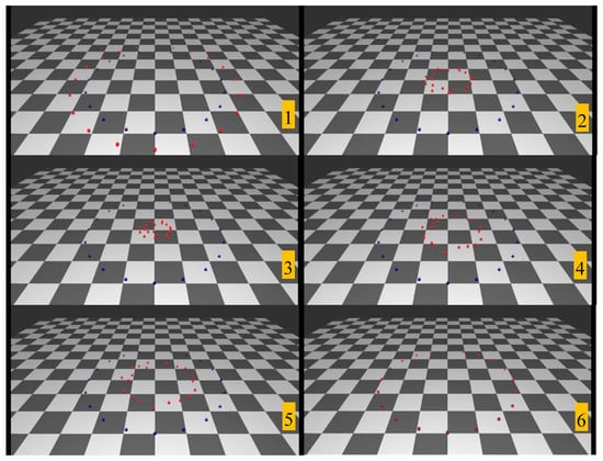 Figure 10 shows another simulation example, where all agents formed a circle at the beginning and tried to get to the opposite target positions. The time constraints were set to make them arrive at the targets simultaneously, which is a harsh condition, as there is heavy traffic at the center. The result shows that all agents were able to solve the situation, and eventually maneuver to their targets at the same time. The total simulation time was around 24 s, which took longer than other scenarios due to the heavy traffic in the middle.