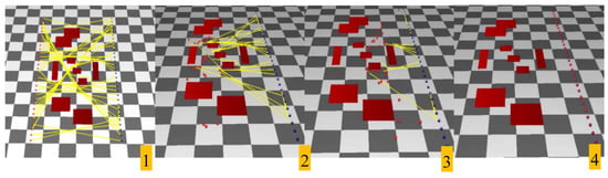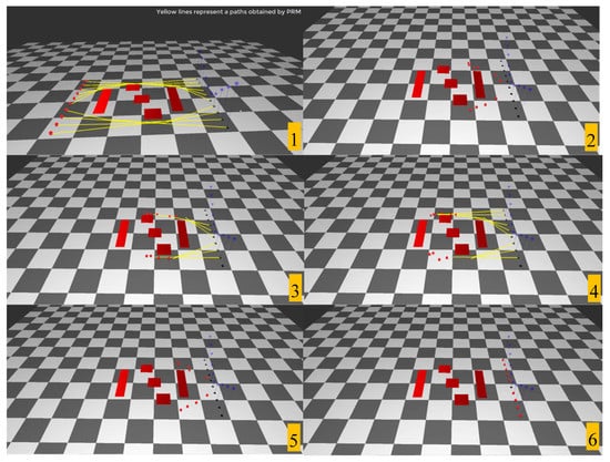 A crowd simulation system was built on Microsoft Windows 10. The hardware specifications included the following: a single Intel i7 CPU with a 16 GB main memory. The graphics card was NVidia’s GeForce GTX 1060. OpenGL was used for 3D rendering. The library for the original ORCA algorithm was provided by [17]. For all the experiments in this section, the number of samples of the PRM planning was set to 1000, the perturbation value of r was set to 1.0, and the distance constant k for calculating in Equation (3) was set to 5.0. For the ORCA, the maximum speed was set to 2.0 and the agent’s size, ri was heuristically set to 0.5. For fast neighbor searching, a simple grid-bin method was used on a KD (K-dimension) tree structure. To increase the understandability of the figures in this section, a result video was created. Please refer to the accompanying video and Supplementary Materials at online https://youtu.be/qu_sxFoRhdg.