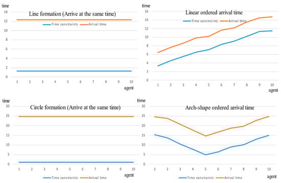 Figure 13 shows how the algorithm makes the agents satisfy the arrival-time constraints. The x-axis represents the particular agents and y-axis indicates the time domain. The time constraint and the actual arrival times are put in the same time domain together for comparison, although the two are conceptually different. The value of time constraints shown in blue lines indicate y, the time points of the environment, and orange lines indicate absolute arrival times. As can be seen in the figure, the two lines have almost identical shapes, meaning that the agents’ arrival times satisfy the constraints.