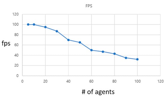 The graph in Figure 14 represents the performance. On the same complicated environment as in the final scenario, the number of agents were increased from 5 to 100 and the frame rate was checked. The result shows that the proposed algorithm has linear performance as the number of agents is increased, and maintains a stable real-time performance. Even when the number of agents was increased to 100, the framerate did not go below 40 frames/s, which substantiates the real-time performance. Note that the framerate takes the simulation and rendering times into account.