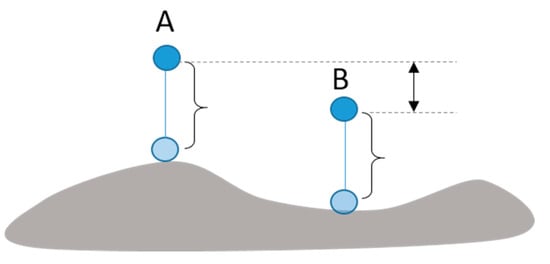 However, the proposed algorithm and the user interface have limitations. Since we assume that the y-axis of the environment represents time, the algorithm is not applicable to non-flat environments. However, this can be resolved as the height of the environment can be taken into account when the time constraints are set. Figure 16 shows an example. Although A and B have different heights along the y-axis, their arrival times should be the same because their distances from the ground are the same. We would like to extend the proposed interface for this kind of uneven terrain. Another limitation is that there may be cases where the time constraint cannot be satisfied. In particular, when agents are occupied with avoiding collisions, there is no time to adjust their velocities to satisfy the time constraints. In that case, our algorithm may not work. For example, when a large number of agents are densely packed in a highly complicated environment they get stuck and barely move to their targets. In this case, adjustment of velocities cannot be carried out as all agents are engaged in avoiding collisions. In the future, we would like to find a density threshold parameter within which the proposed algorithm would continue to work. Furthermore, all experiments are carried out assuming that all the constraints are set reasonably. However, arbitrarily set constraints may cause the algorithm to fail. On the user interface level, these kinds of constraints can be prohibited by limiting the position of time points. This can be taken up as a future study.