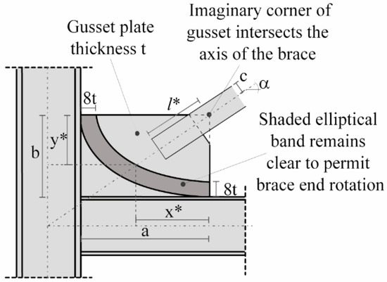 For connections accommodating the buckling of braces under compression in one plane, the requirement given by Equations (7) to (9) should be met in the restrained plane. In the plane of the buckling, Equation (8) should be satisfied, and the connection should be properly designed to have enough rotational capacity to accommodate the required rotation at the design story drift. Inelastic rotation can be generally sustained by using gusset plate connections with the brace ending before a linear (Figure 1) or elliptical (Figure 2) clearance corresponding to the theoretical yielding line of the gusset plate [92].