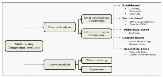 Passive techniques work without any prior information on the authentic data. They can detect manipulation by exploiting the content-based features of images and videos (i.e., the statistical visual information). Verifying the integrity of digital media and detecting traces of tampering without using any pre–embedded information has proven to be effective for digital forensics (like the case of scene crime analysis). The integrity can be verified passively in order to identify traces like cloning, sampling, re-sampling, and inconsistencies in lighting. Such a process is able to ensure the future protection of the authenticity and credibility of digital data. To perform passive tampering detection, various criteria must be considered in order to develop robust multimedia forensic tools (see Figure 4) such as pixel-based, physically-based, camera-based, format-based, and geometric-based tools [12]. It is also possible to categorize existing detection methods into two main categories: intra-tampering and inter-tampering for both cases images and videos.