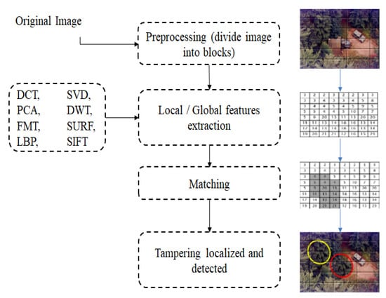 Several surveys have been carried out on this hot topic and recently some papers reviewed several image tampering detection techniques [12,28,51]. Most copy-move tampering detection (CMTD) techniques share some common procedures and steps, which are: Feature Extraction and Feature Matching. The feature extraction step has the role of extracting relevant information that describes the treated image. Conventional feature extraction techniques reported in the literature are based on frequency transforms (discrete wavelet transform (DWT), DCT, PCA), polar transform (Fourier–Mellin transform (FMT)), moment transform (Hu, Zernike), local invariant keypoints, or texture (local binary pattern (LBP), Gabor transform). These features are often extracted from overlapping or non-overlapping blocks (i.e., image regions). Then, this is followed by a matching step to determine similarities between extracted features which result in detecting suspected regions. In general, matching stage is performed on the basis of the divided blocks or extracted keypoints. For instance, SIFT keypoints are matched using distance measure withing a clustering process that cluster closest points into similar groups. It is also important to mention that many of the data reduction techniques (e.g., SVD, PCA) are frequently and simultaneously applied within feature extraction step to reduce the dimensionality space and the computational complexity. In particular, singular value decomposition (SVD) is one of the methods often used thanks to its robustness with respect to geometric properties, rotation, filtering, and scaling. It turned out to have higher overall performance compared to other techniques like principal component analysis (PCA) and locally linear embedding (LLE). Furthermore, there is sometimes a need for a post-processing step to be applied in order to remove outliers from matched regions and to refine the final detection result. Many CMTD methods have been proposed so far and can follow either the block-based or keypoint-based principle. The general principle of CMTD detection process is depicted in Figure 5.