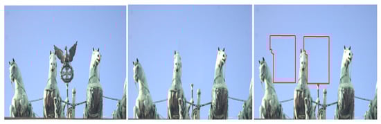 Copy-move attack detection: original image (left), tampered image (middle) and result after detection (right). Results obtained with the method in [33].