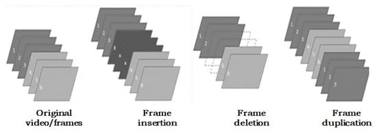 In this section, we report some relevant and recent works developed for video tampering detection. Many of these works are able to detect suspicious objects or frames based on digital video characteristics. To date, several implemented methods focus on identifying inter-frame or intra-frame tampering [22,102,103,104,105,106,107,108,109,110,111,112]. Intra-frame-based methods can occur in either a spatial or spatio-temporal domain (like frames copy-move or splicing). However, the inter-frame based methods (see Figure 11) takes place in the temporal domain (like frame insertion, removal and duplication). One of the pioneering works in this area has dealt with the so-called frame duplication detection [113], by taking into account the correlation information between successive frames. Different types of attacks and counterfeits can occur to disappear and remove video evidence. Thus, effective clues must be exploited to uncover these counterfeits including for instance velocity and physical inconsistencies [103,107], motion residuals [111], and statistical-contour features [109].