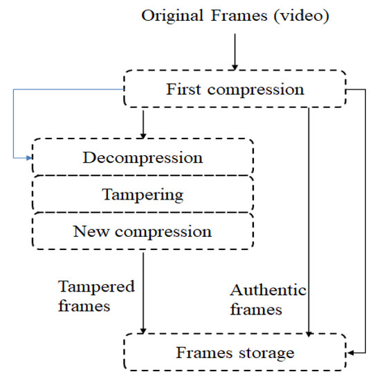 In general, video tampering is detected by verifying spatial alterations such as frame compression [114,115] or temporal modifications such as frame addition or deletion [116,117]. Among the passive forensics’ techniques, double compression is one of the substantial clues for video tampering detection. When handling compressed video, attackers follow certain steps to modify this video by first decoding this video, then by manipulating it and finally by recompressing it. This scenario is well illustrated in Figure 12. Obviously, this scenario will leave traces and footprints that can be exploited as valuable information for forensic analysis [118,119,120,121,122]. Some studies have addressed the problem of double compression detection including, but not limited to, the one in [118], which is based on the use of efficient spatio-temporal features evaluated on the basis of local motion vector field.
