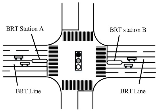 Generally speaking, a BRT station is set at the entrance or exit of the intersection to facilitate pedestrians to get on and off the bus by using the crosswalk. However, a BRT will be significantly disturbed by the red light at the intersection regarding whether it is set at the entrance or exit. In this paper, a BRT station is set at the entrance and exit of the intersection, as shown in Figure 1.