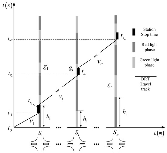 As shown in Figure 3, t0 is the departure time of the BRT vehicle; l1 is the distance between the departure station and the intersection S1; the time when the BRT vehicle arrives at station 1 by speed v1 is t11; f1 is the 1/v1; after reaching station 1, the stopping time of the BRT vehicle is ts1; x1 is a 0–1 variable. When x1 = 0, the BRT vehicle stops at the exit station; when x1 =1, the BRT vehicle stops at the entrance station.