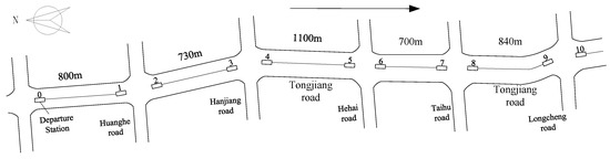 Based on field research, the signal timing of the morning peak (north-south straight) intersection of Changzhou BRT Line 1 and the distance between adjacent intersections are shown in Figure 4 and Table 1.