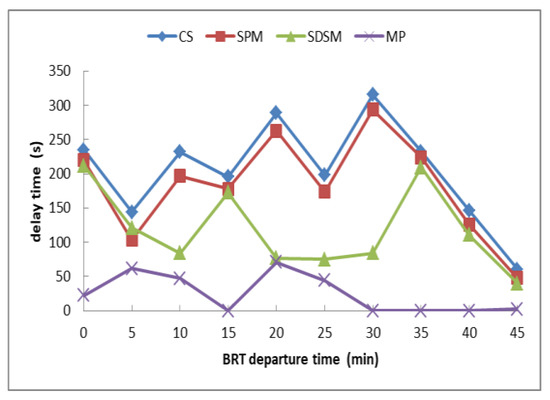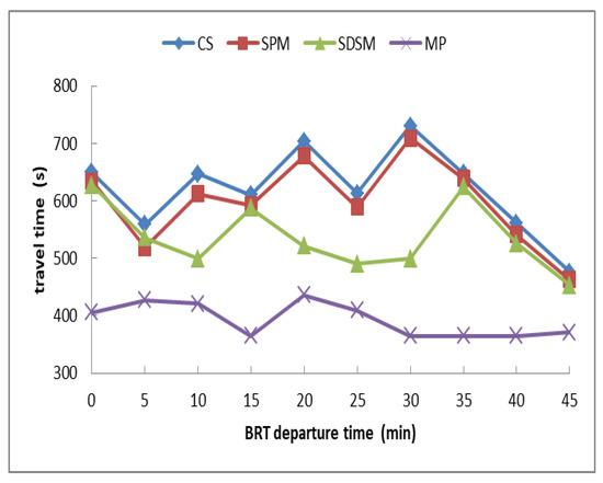 It can be seen from Figure 5 that the travel time of the BRT under the three control methods has been reduced. Compared with the current situation, the average travel time of signal priority method (average travel time of ten BRT shifts) is reduced by 22.31 s (3.6%), the average travel time of dual station method is reduced by 83.63 s (13.50%) and the average travel time of method proposed in this paper is reduced by 226.89 s (36.59%). Except for BRT of 5 min, 10 min and 20 min, the travel time of the rest departure time in method proposed in this paper is less than 415 s (the scheduled travel time of BRT vehicles from the departure station to S5).