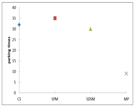 As can be seen from Figure 7, the number of stops (the number of stops caused by red light delay of BRT in 10 shifts, excluding the number of waiting for passage after getting on and off the station at the entrance) for current situation, signal priority method, simple double platform method and this method are 32, 35, 30 and 9, respectively. Compared with the current situation, the number of stops of signal priority method, simple double platform method and this method is reduced by −3 (−9.4%), 2 (6.2%) and 23 (71.8%) times, respectively. The average stopping times (the average stopping time of a total of 50 intersections for BRT of ten shifts) of the current situation, signal priority method, double platform method and this method are 0.66, 0.7, 0.6 and 0.18, respectively. Therefore, the proposed model can greatly reduce the number of BRT stops and enhance the stability of BRT.