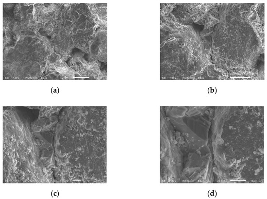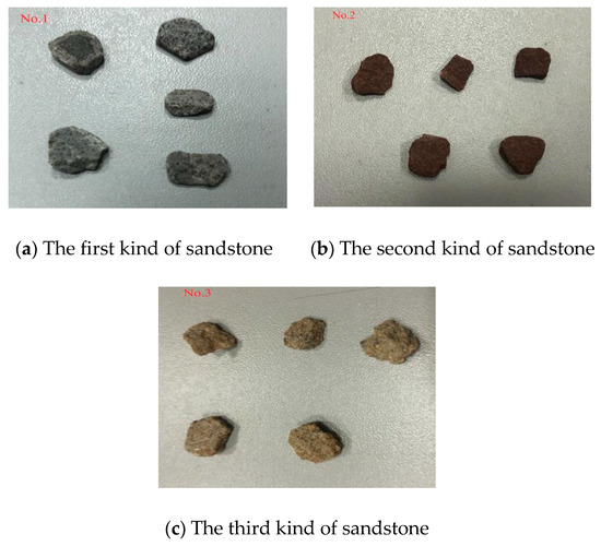 From Figure 2, Figure 3 and Figure 4, it can be observed that the meso-surface of the first type of sandstone is flat, the flake particle structure is less and orderly stacked, and the particles at the pore position are relatively loose. The overall structure of the second type of sandstone is more obvious, but the particles are obvious, stacked tightly, and the pore structure is more. The third type of sandstone shows a honeycomb porous loose structure, the overall meso-structure is relatively loose, there are many particles, and, between particles, the cementation degree is not good, the pores are more obvious, and there are small particles filling into the pore structure.