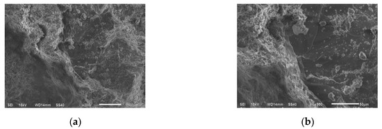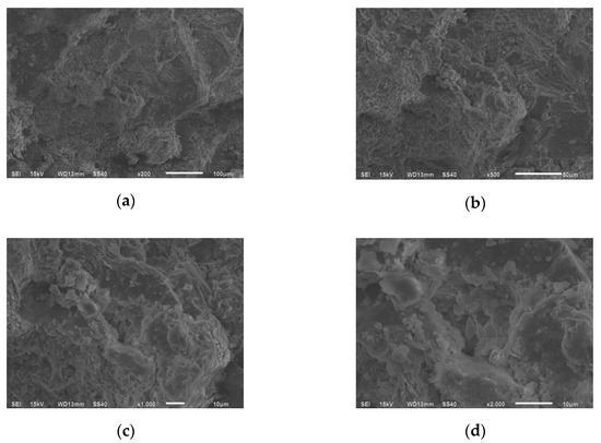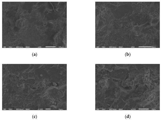 The meso-morphology of three types of sandstone was observed by SEM [27,28]. When using SEM to observe, it is necessary to keep the sample dry enough and do gold plating on the observation surface. Images with magnification of 200, 500, 1000 and 2000 were selected (Figure 2, Figure 3 and Figure 4).